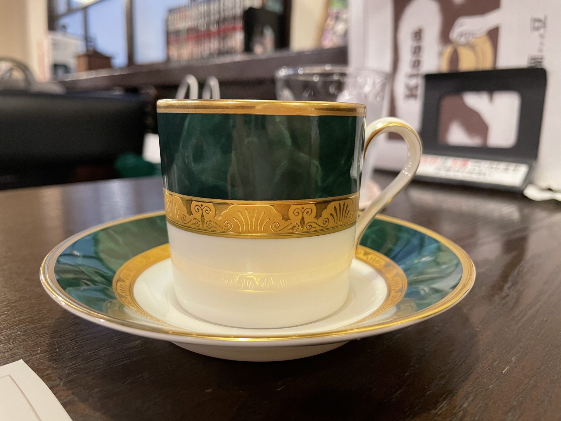大理石のような色合いのグリーンとゴールドのレリーフが美しく、高級感のあるカップです。