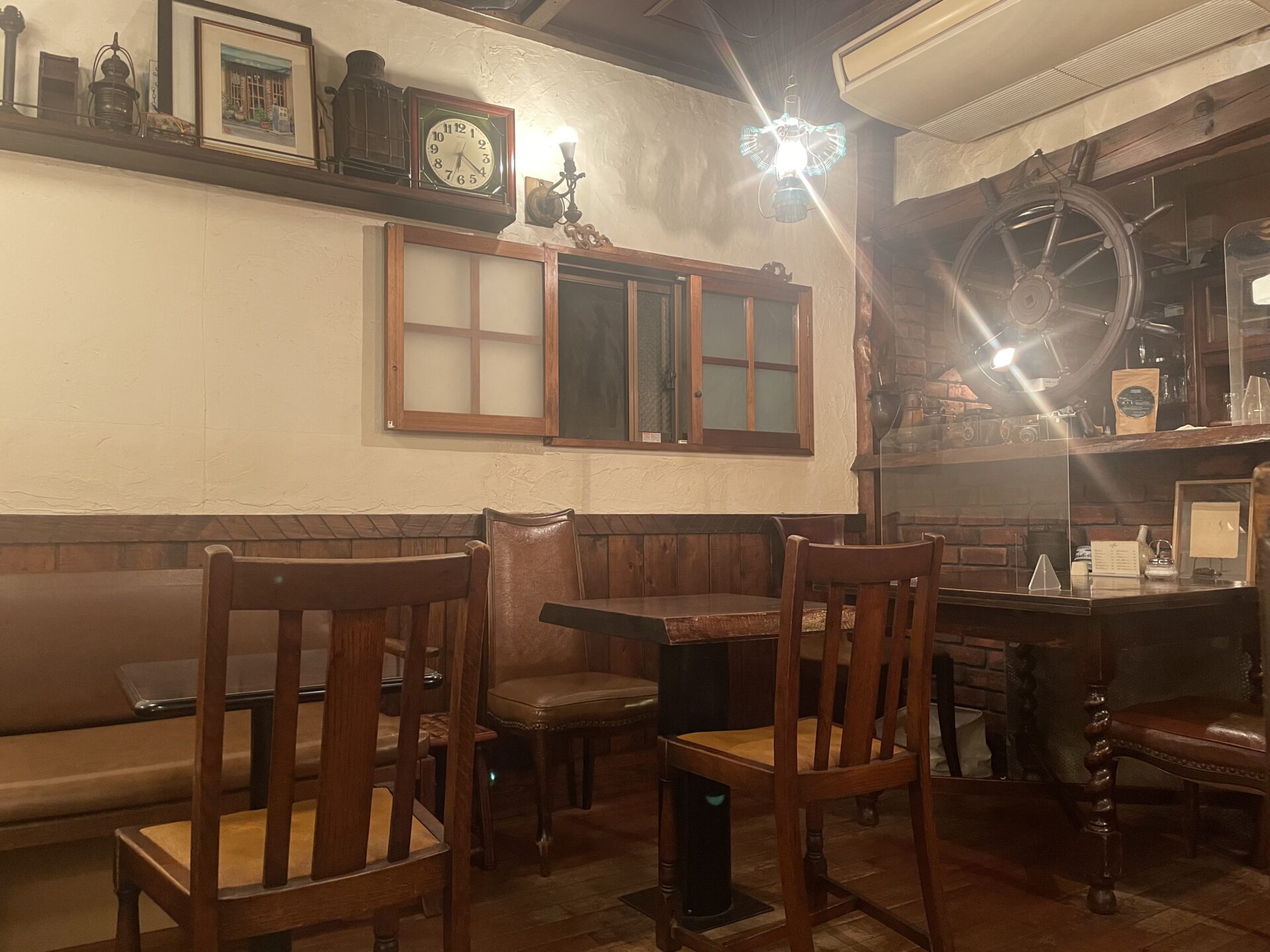 アンティークの小物や壁のイラストに見惚れてしまいます。特に大きな船のハンドル(舵輪)が印象的です。